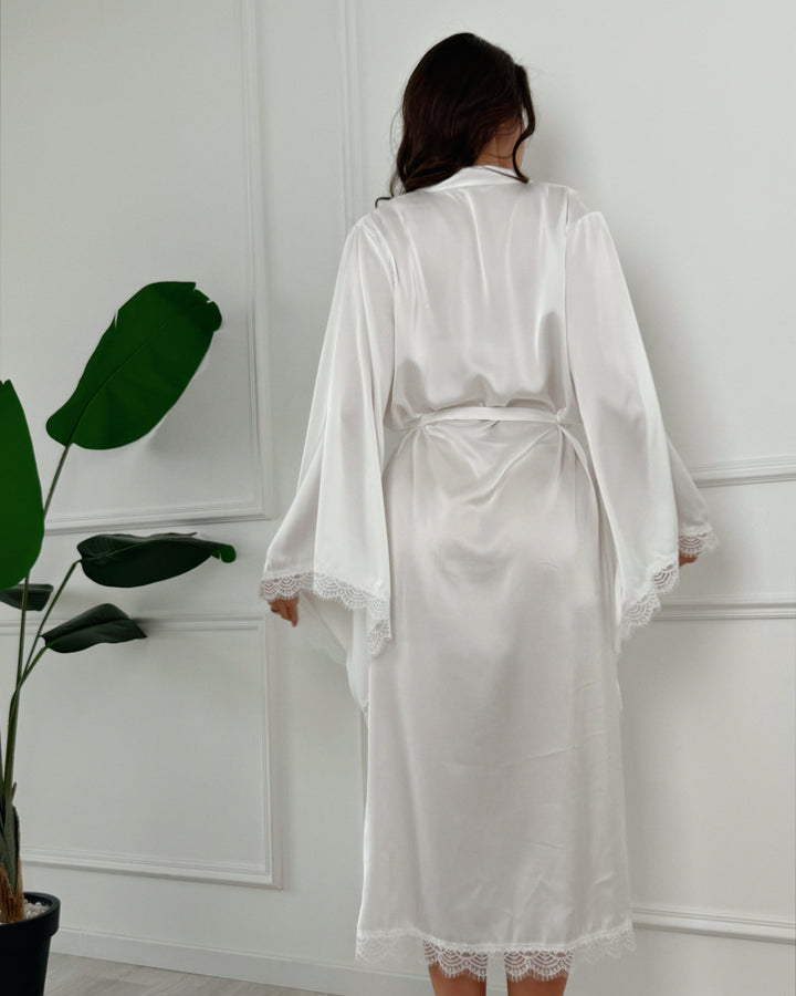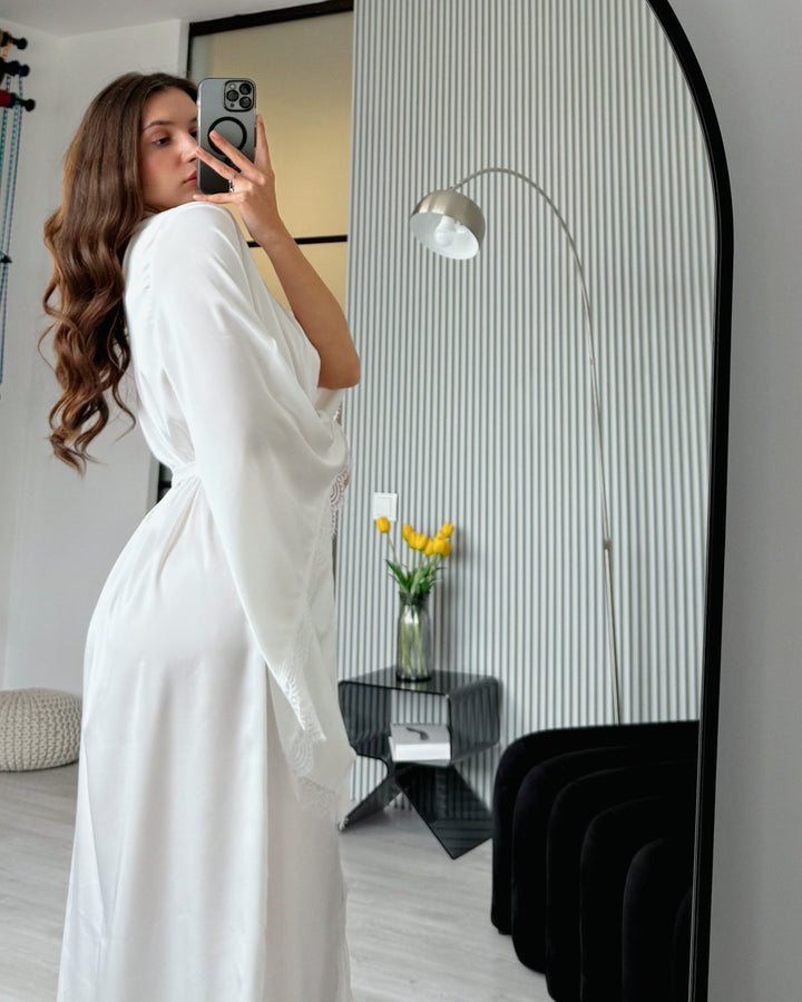 Елегантний довгий халат із атласу з ніжним мереживом по краях додає витонченості кожному руху ✨