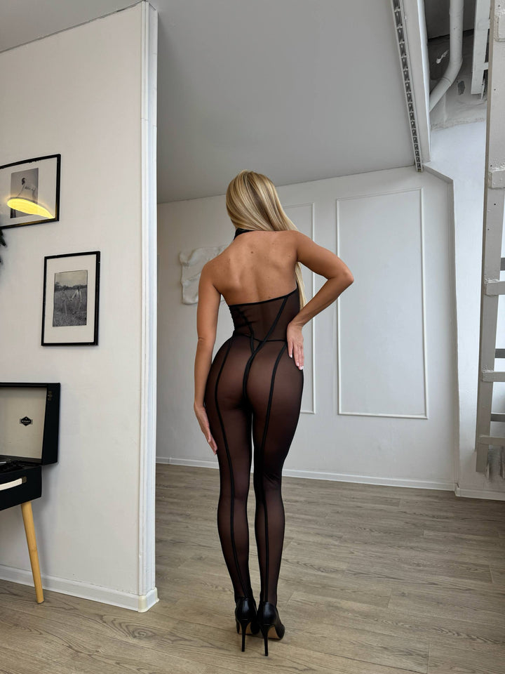 Напівпрозора тканина ніжно огортає тіло, а вертикальні лінії візуально витягують силует 🖤