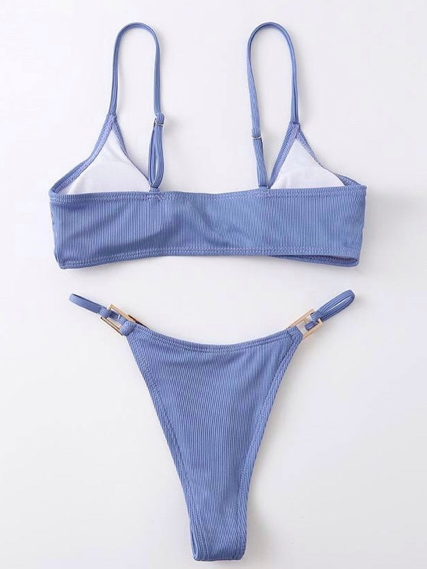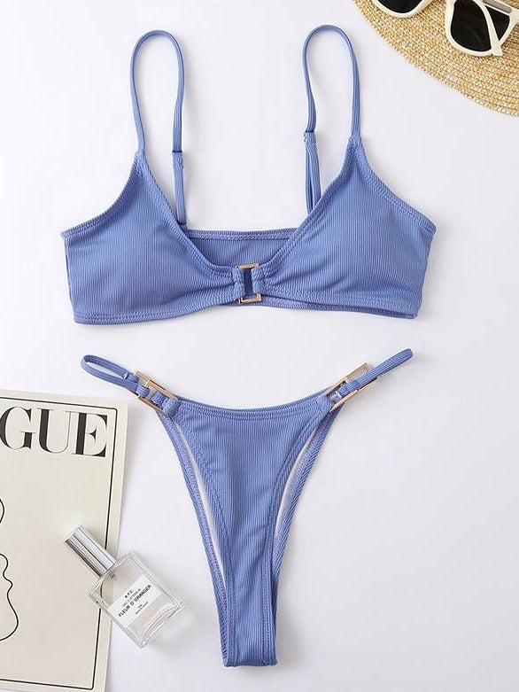 Стильний купальник-бікіні з металевими акцентами та текстурної рибани створений для сміливих образів.