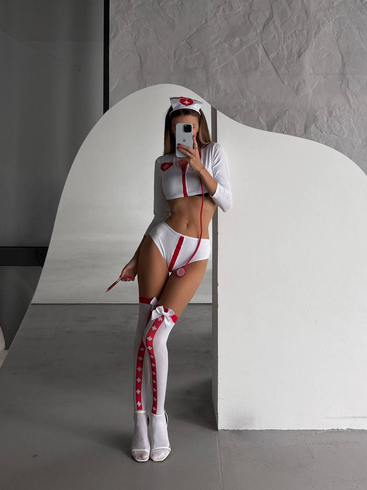 Комплект виконаний з еластичної тканини, з деталями латексу. Топ коротенький, на змійці. Трусики високої посадки, по формі бразиліани. Обруч гарно тримає форму, стетоскоп розбірний та шприц це ручка.