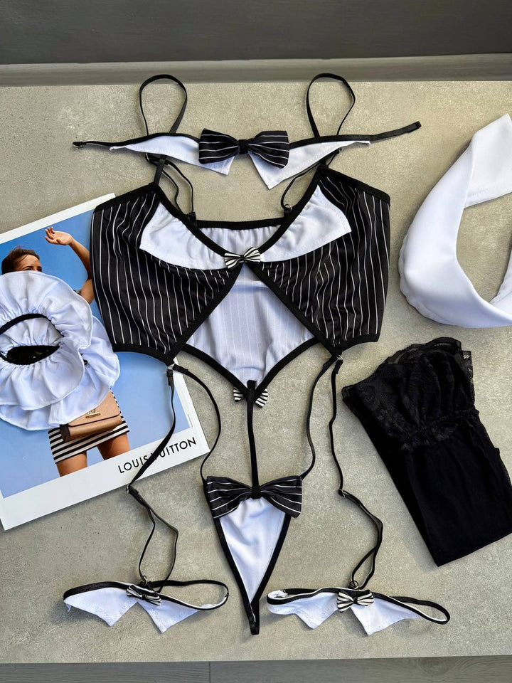 Боді повністю суцільне, з еластичної тканини декороване бантиками. Шлейки та підв'язки на регуляторах, трусики стрінги. Чокер позаду на гачках, пов'язки на ручки на резинці. Панчохи класичні, без мережива ✨