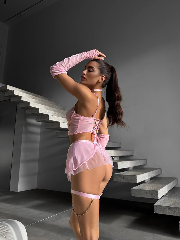 Комплектація: бюст з чокером, трусики, спідничка, гартери, рукавички