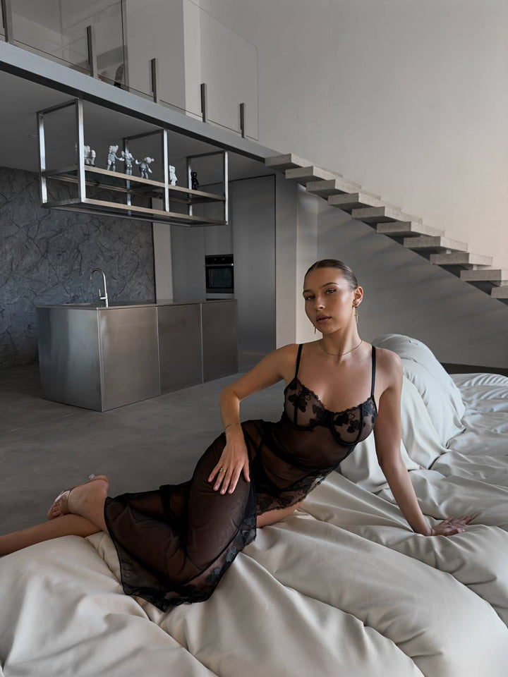Ніжна довга еротична сукня з витонченими акцентами по лінії грудей і глибоким вирізом. Напівпрозора тканина додає загадковості, а регульовані бретелі забезпечують комфортну посадку. У комплекті трусики.