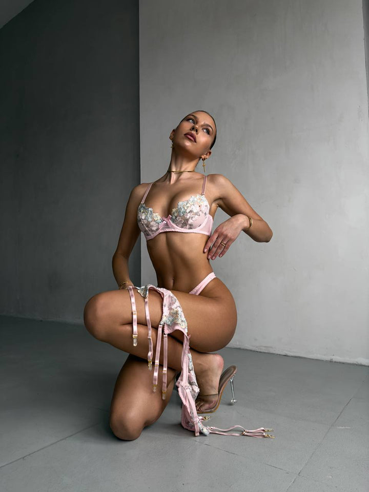 Елегантний комплект із вишуканою вишивкою. Бюстгальтер на кісточках із регульованими шлейками та трьома рівнями застібки. В комплекті пояс і підтяжки.