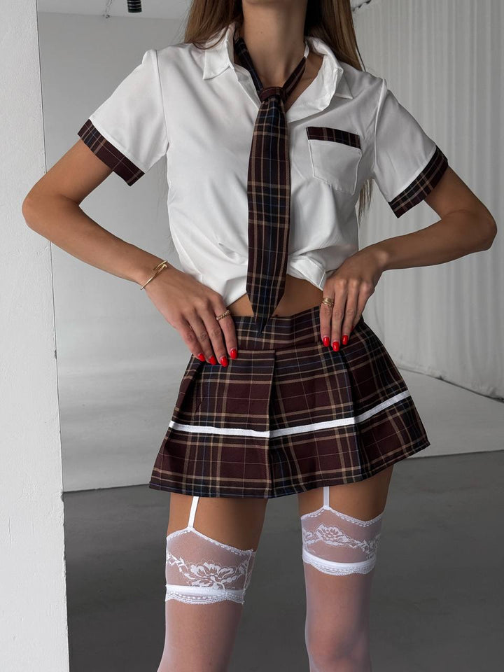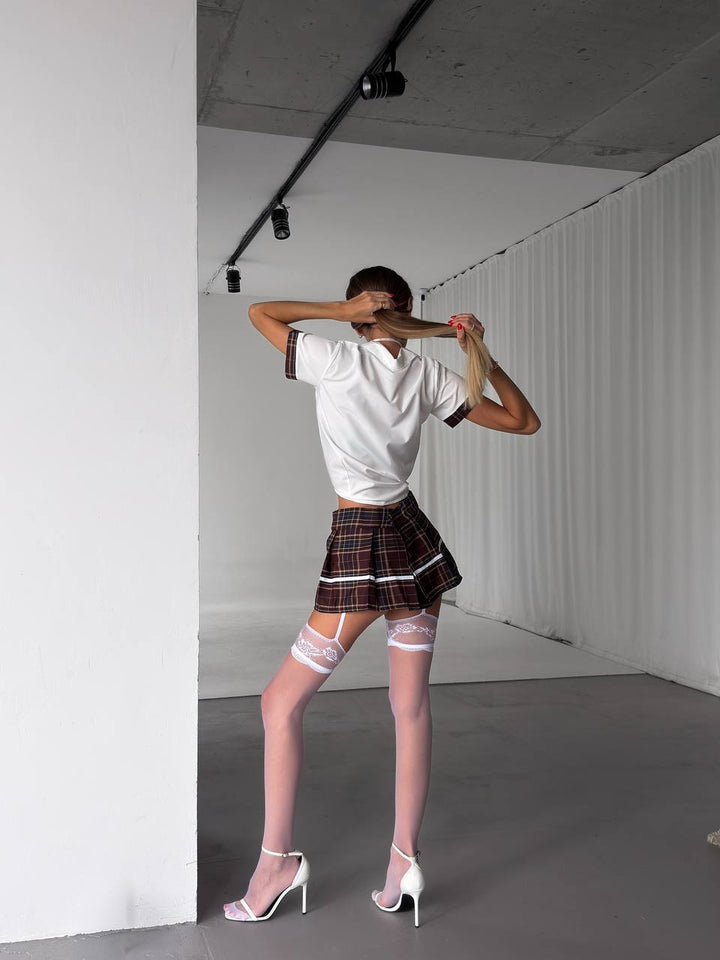 Сорочка подовженого крою на ґудзиках. Знімний галстук із регулятором об’єму. Бейджик з еко-шкіри на шпильці. Спідничка з щільної тканини, без резинки, ззаду на липучці — зручно регулювати об’єм.