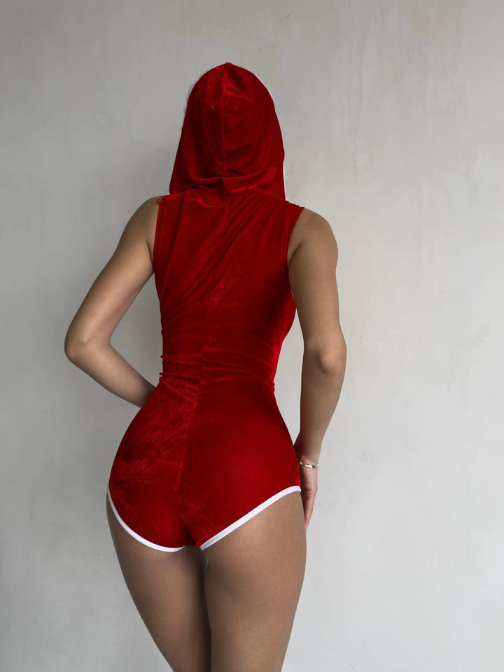 Святковий комбінезонна блискавці. Дизайн доповнений м'яким хутряним декором, що імітує костюм Санти. Зручний крій робить його універсальним елементом образу. У комплект входять пояс та гольфи. Панчохи продаються окремо.