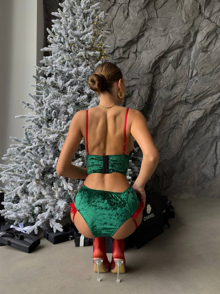 Новорічний комплект, створений для святкових образів та акценту на фігурі. Бюст має кісточки та регулятори для комфортної посадки. Трусики середні по висоті, м’яко підкреслюють талію.
