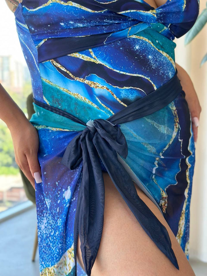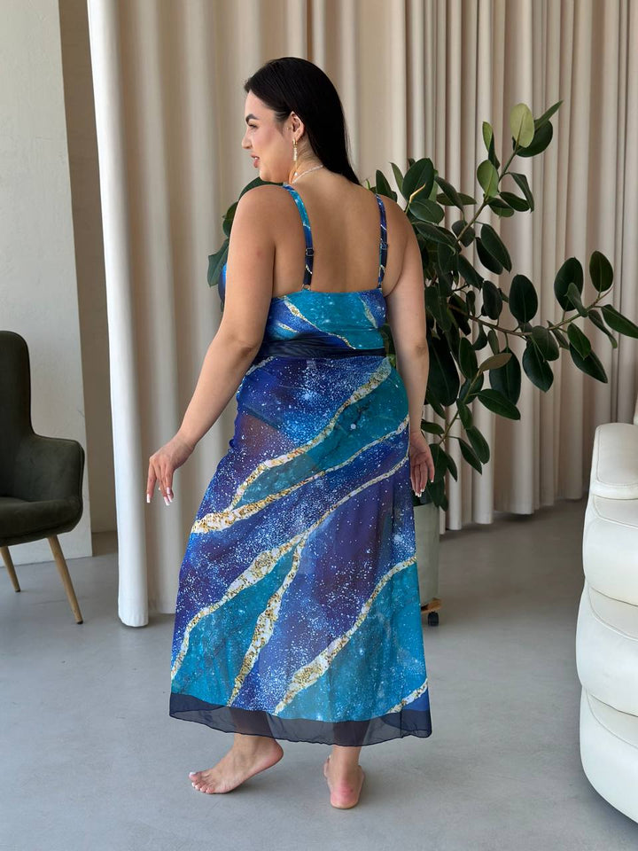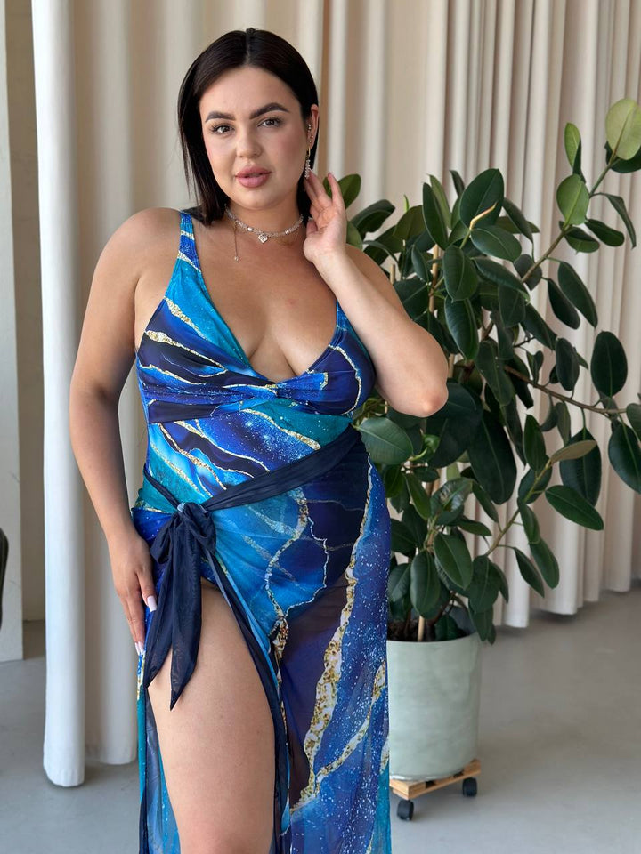 Купальник із глибоким вирізом і чашечками без кісточок. Посадка підтягує фігуру й підкреслює талію. Тканина швидко сохне, добре тягнеться та не вигорає на сонці.