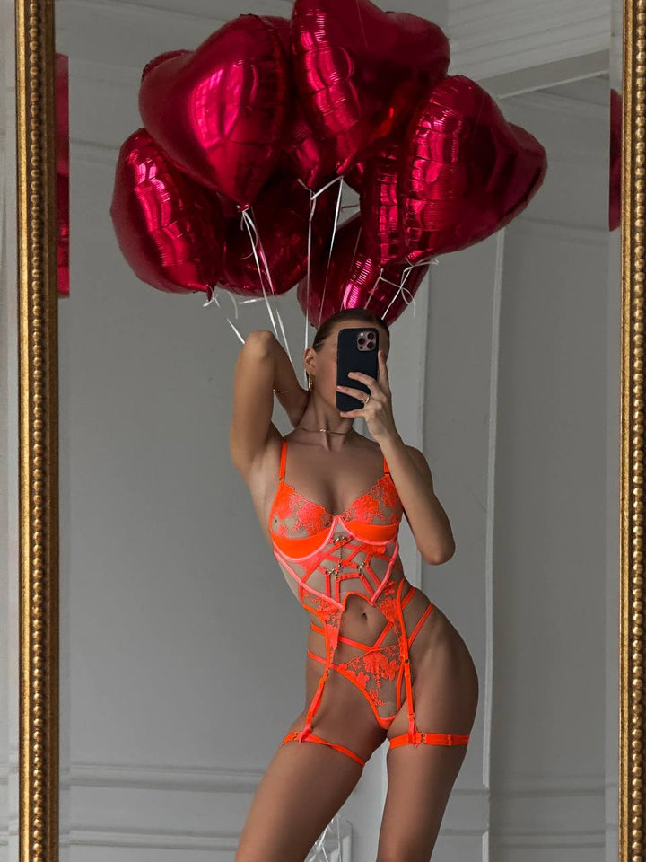 Цей комплект – не просто білизна, а вибух емоцій і магія спокуси. Гармонійне поєднання мережива, витончених ланцюжків і ремінців створює яскравий образ, що приковує погляди.